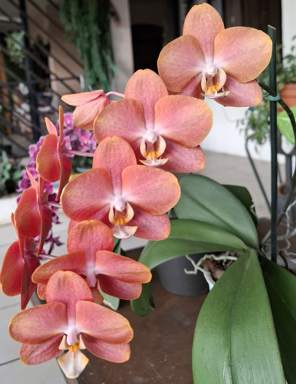 A coral colored orchid with the flowers in simetrical lines, with yellow details on the petals and a white center of the flower